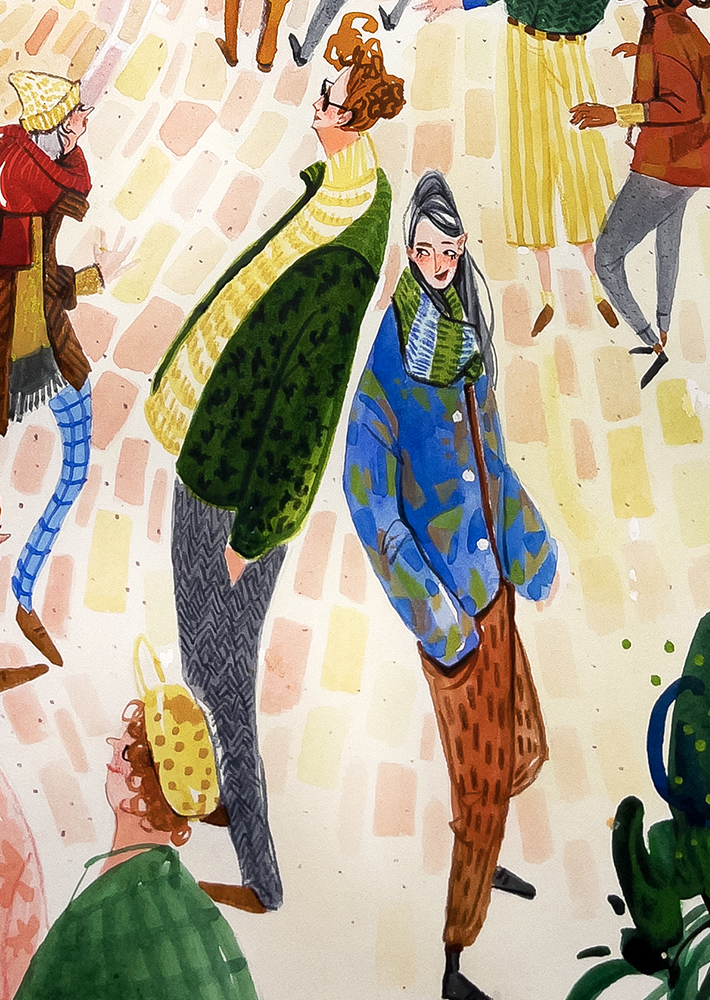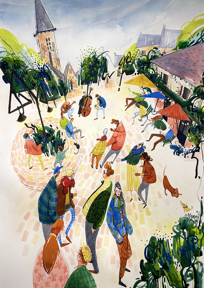Cette scène est inspirée de la place de l’église de notre ville Gif-sur-Yvette, lors des concerts, toujours très animée.