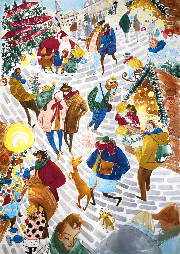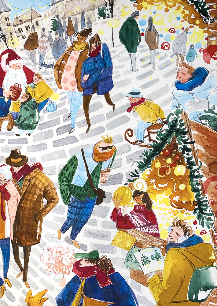 Marché de Noël J’ai tenté pour la première fois un grand format A3 avec beaucoup de personnages 🎄 Illustration inspirée du marché de Noël de ma ville. Pas parfait, mais une belle expérience ! Cadre décoratif: Freepik Durée de réalisation: 4 jours Category: Mix media Date: décembre 10, 2025 Tags: Illustrations Scène urbaine Share: