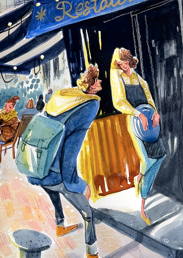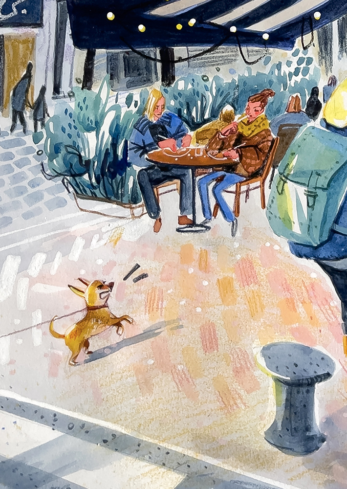 Presque l’amour "Presque une scène d’amour… jusqu’à ce que le chihuahua ne soit pas d’accord. " Illustration réalisé avec l’aquarelle, les crayons Derwent Inktense, les pastels aquarellables Caran d’Ache, et la gouache acrylique Holbein sur A3. Cadre décoratif: Freepik Durée de réalisation: 1.5 jours Category: Mix media Date: février 12, 2026 Tags: Illustrations Numérique Scène urbaine Share:
