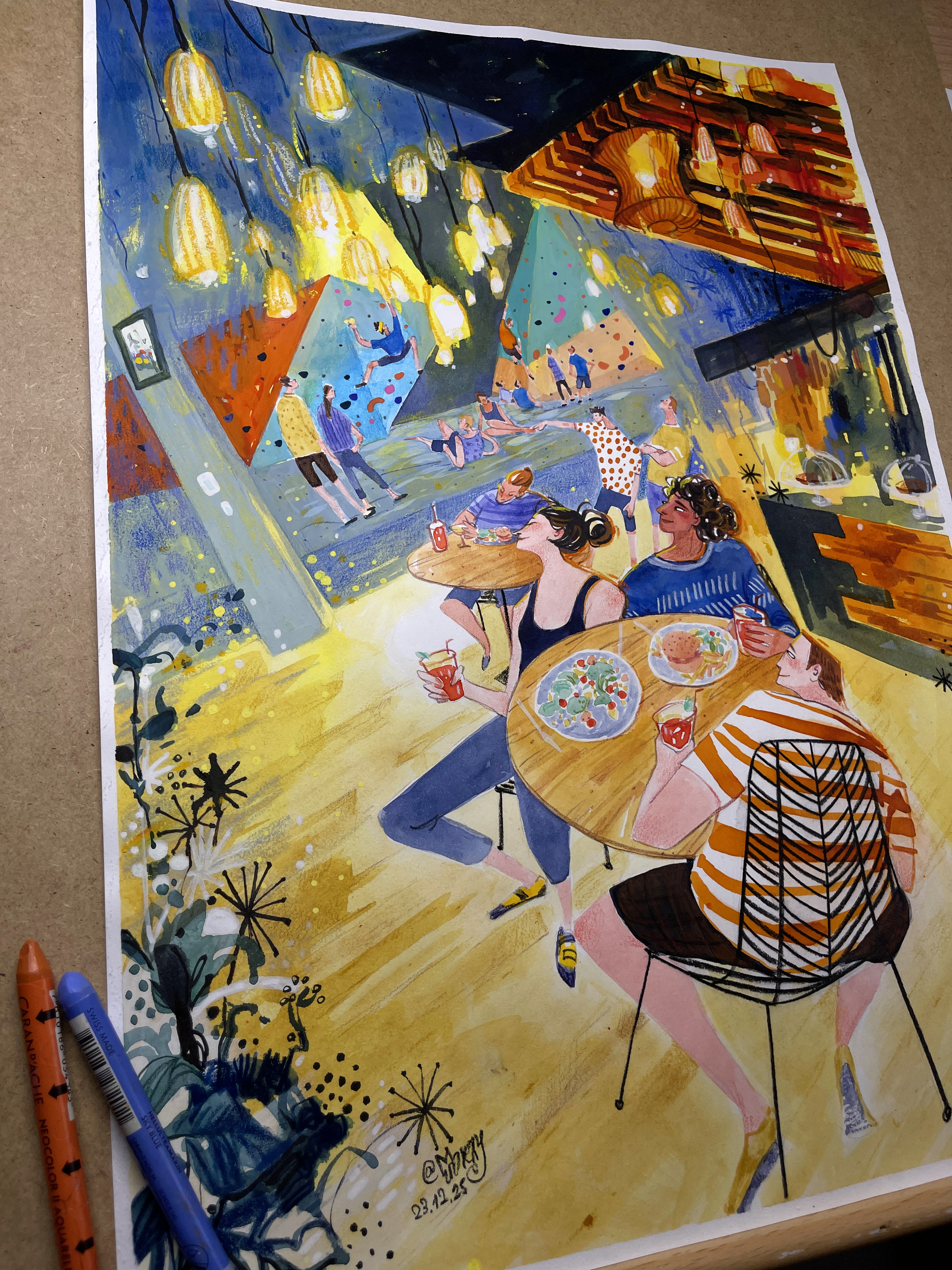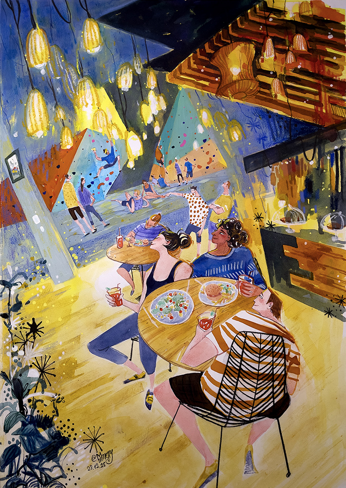 Vertical’Art saint Quentin en Yvelines, on y va souvent : l’ambiance est moderne, familiale, super accueillante. Je prends souvent un noisette et fais mes croquis en observant les grimpeurs, j’aime profiter ces moments simples, vivants, pleins d’énergie.